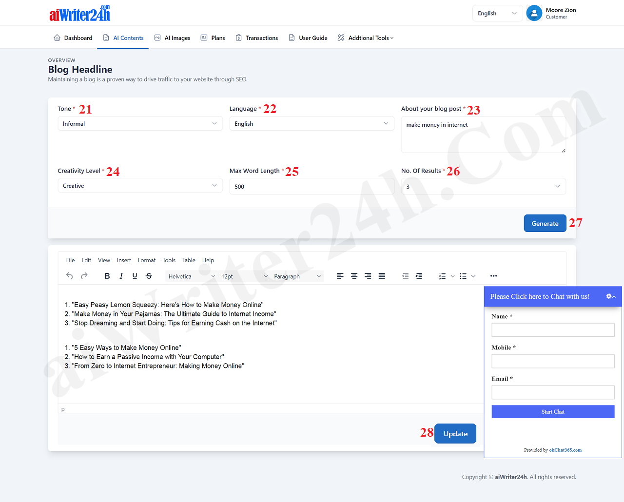 => After you have just finished input all things in that form, you click on Generate (27) button to create title via aiWriter24h.com.
